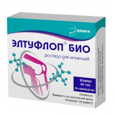 Механизм действия: Согласно экспериментальным данным, лекарственный препарат обладает уникальным свойством одновременно стимулировать синтез гиалуроновой кислоты и тормозить активность гиалуронидазы. Основой для клинического применения ЭЛТУФЛОП® БИО послужили данные о важнейшей роли гиалуроновой кислоты в поддержании нормальной структуры и функции суставного хряща. Гиалуроновая кислота служит осью для агрегатов протеогликанов, которые, наряду с коллагеном, являются главными компонентами основного вещества хряща. В высоких концентрациях она усиливает синтез протеогликанов и тормозит активность металлопротеиназ (в частности коллагеназы), разрушающих хрящ. В синовиальной жидкости гиалуроновая кислота выполняет роль лубриканта, то есть уменьшает трение между соприкасающимися структурами сустава. Весьма вероятно также, что при достаточно высокой концентрации в суставной полости она способна уменьшить проявления вторичного синовита за счет адсорбции на своих крупных молекулах ряда медиаторов воспаления, включая цитокины. Способность лекарственного препарата одновременно увеличивать синтез гиалуроновой кислоты и уменьшать ее деградацию позволила рассматривать его как весьма перспективный препарат для лечения остеоартроза, поскольку при данном заболевании продукция гиалуроновой кислоты и протеогликанов фибробластами сустава снижена. Фармакодинамические эффекты ЭЛТУФЛОП® БИО - хондропротектор, активным компонентом которого является биоактивный экстракт из мелкой морской рыбы. Экстракт содержит мукополисахариды (хондроитина сульфат), аминокислоты, пептиды, ионы натрия, калия, кальция, магния, железа, меди и цинка. ЭЛТУФЛОП® БИО предотвращает разрушение макромолекулярных структур нормальных тканей, стимулирует процессы восстановления в интерстициальной ткани и в ткани суставного хряща, что объясняет его обезболивающее действие. Противовоспалительное действие и регенерация тканей основаны на угнетении активности гиалуронидазы и нормализации биосинтеза гиалуроновой кислоты. Оба эти эффекта синергичны и обусловливают активацию восстановительных процессов в тканях (в частности восстановление структуры хряща).