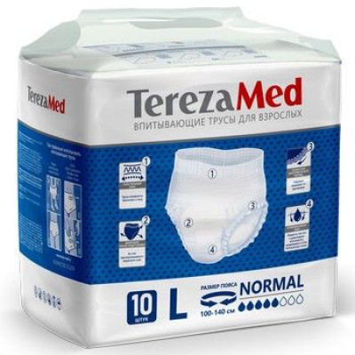 Трусы-подгузники TerezaMed - изделия санитарно-гигиенического назначения разового использования для взрослых. Защитные бортики, а также резиночки вокруг талии и ног препятствуют протеканию в любом положении тела. Специальная структура внешнего слоя пропускает воздух, но не пропускает жидкость. «Дышащие» изделия снижают риск возникновения раздражений. Благодаря эластичному пояску впитывающие трусики прилегают к телу. Специально разработанный внутренний слой обеспечивает быстрое и равномерное впитывание влаги, а так же снижает распространение неприятного запаха
