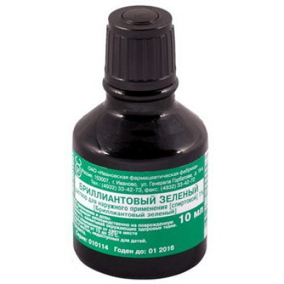 Действующее вещество: Бриллиантовый зеленый - 1 г. Вспомогательные вещества: Этанол (спирт этиловый) 95 % - 56 г, Вода очищенная - до 100 мл.