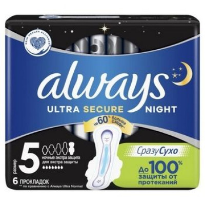Always Ultra Night (Размер 5) с системой InstantDry мгновенно впитывают влагу и удерживают ее внутри, обеспечивая до 100% защиты и уверенности. Always Ultra оснащены технологией нейтрализации запаха, которая блокирует неприятный запах, а не просто маскирует его. Always Ultra толщиной всего 3 мм дарят комфорт и обеспечивают непревзойденную защиту во время менструации. Always Ultra имеют защитные контуры SecureGuard и содержат гель, который впитывает и удерживает влагу, помогая предотвращать протекания. Always Ultra Secure Night (Размер 5) имеют удлиненную на 60% заднюю часть. Благодаря этому они обеспечивают еще лучшую защиту от протеканий. Созданы специально для защиты в ночное время.