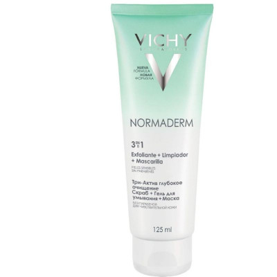 Виши Нормадерм Очищающее средство 3 В 1 Скраб, гель для умывания, маска (VICHY Normaderm 3 en 1 Exfoliante+Limpiador+Mask) - для жирной, комбинированной, проблемной, чувствительной кожи. Возраст до и после 30 лет - кремовая плотная текстура, густая по консистенции, с приятным ароматом